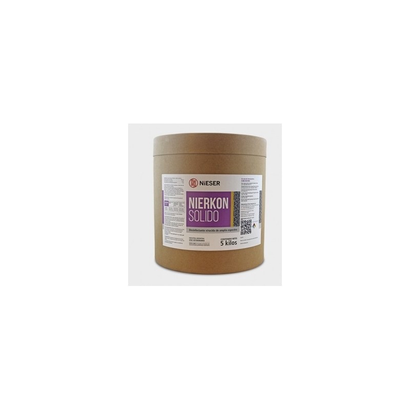 NIERKON SOLIDO Es un desinfectante de acción oxidante. Su agente activo es el monopersulfato de potasio, al que se le suman en sus componentes otros agentes auxiliares diseñados para potenciar la eficacia del agente oxidante. No irrita la piel, ojos ni mucosa respiratoria. No es corrosivo si se utiliza en períodos cortos. Además es un buen surfactante/detergente, lo que le permite ser usado en limpieza además de desinfección. Si se utiliza sobre superficies de metal, estas deben enjuagarse con agua después de 10 minutos con el fin de eliminar el exceso de solución.