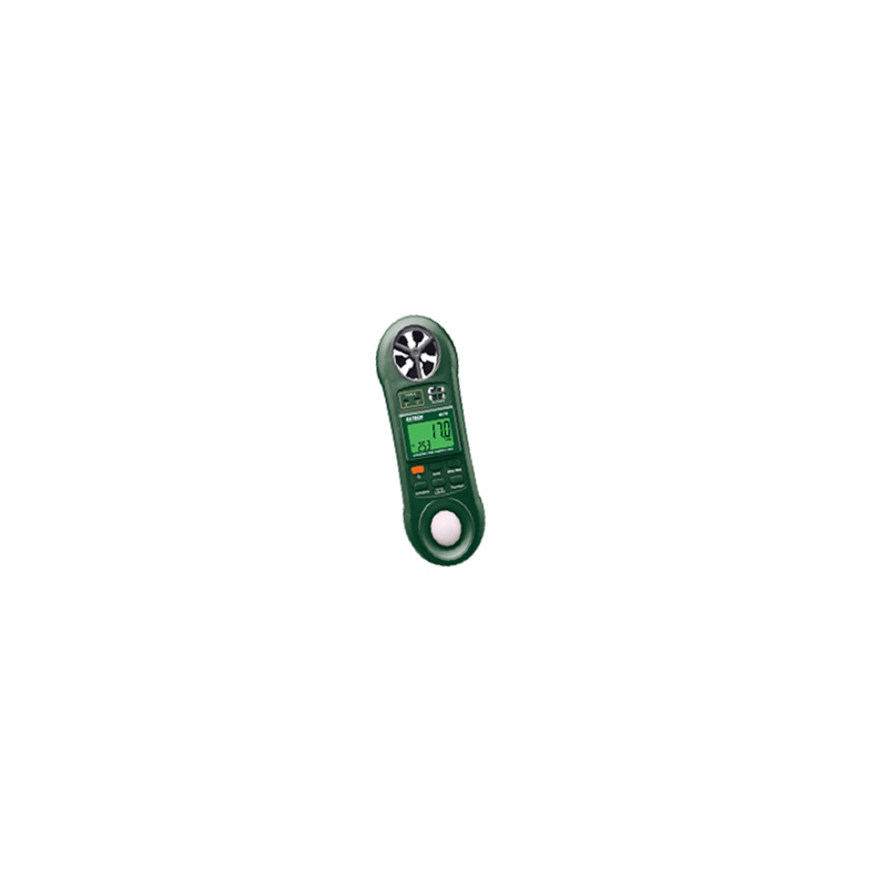 Resistente para humedad, temperatura, velocidad del aire y luz. La carcasa pequeña y ergonómica con doble LCD grande muestra simultáneamente la temperatura y la velocidad del aire o la humedad relativa. Los caracteres en la pantalla cambian de dirección según si está en modo higrotermoanemómetro o fotómetro. Registro de datos para congelar el valor mostrado. Graba lecturas mínimas y máximas. Los brazos de paletas de baja fricción incorporados mejoran la precisión de la velocidad del aire en ft/min, MPH, m/s, km/h y nudos. Sensor de humedad de capacitancia de película delgada de precisión incorporado para una mejor respuesta. Termistor incorporado para medir la temperatura ambiente. Medidas de altas temperaturas con el termopar tipo K. Utiliza un filtro de corrección de color y fotodiodos de precisión. Medidas del fotómetro de color y coseno corregidas. Completo con sensor de humedad incorporado, fotosensor y brazo de paleta, banda para muñeca y batería de 9 V.